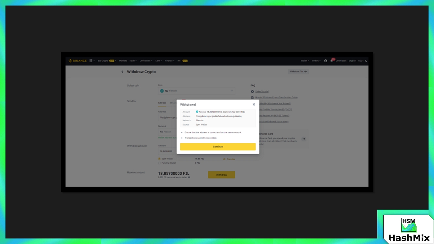 Make sure that the transfer network is FIL (FileCoin). Specify the amount and click “Withdraw”: